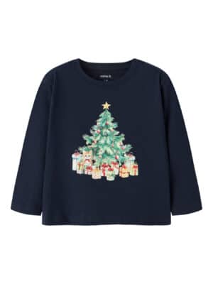 Den sejeste julebluse fra name it. Blusen er blå med en juletræ på.